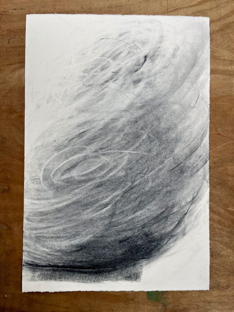 Charcoal, carbon, pencil, pencil crayon, watercolour on Somerset Paper. 38cm x 56cm