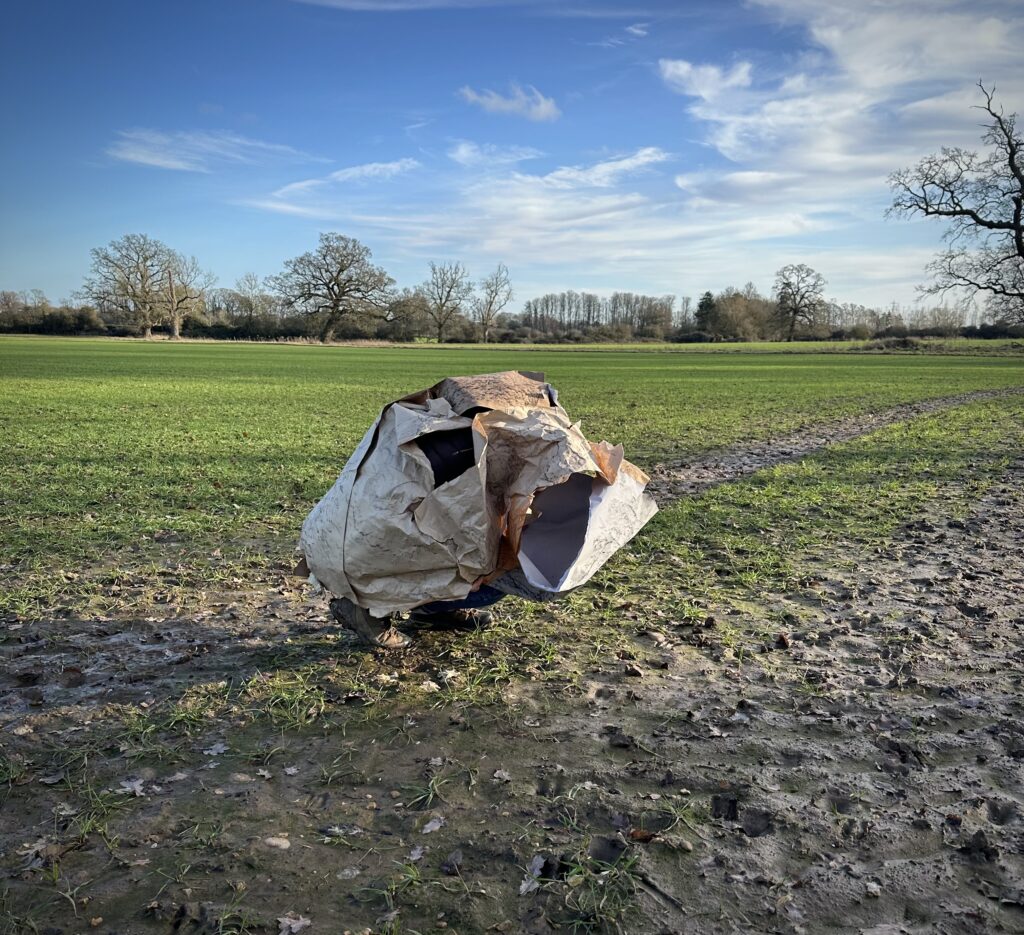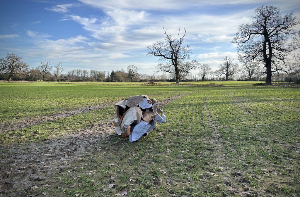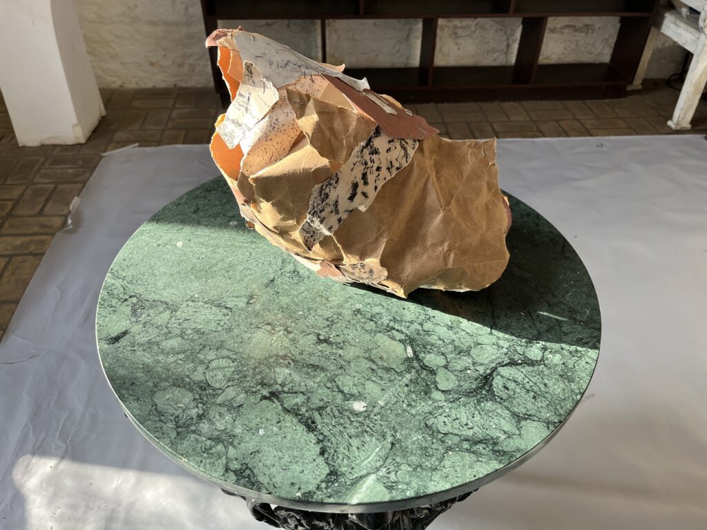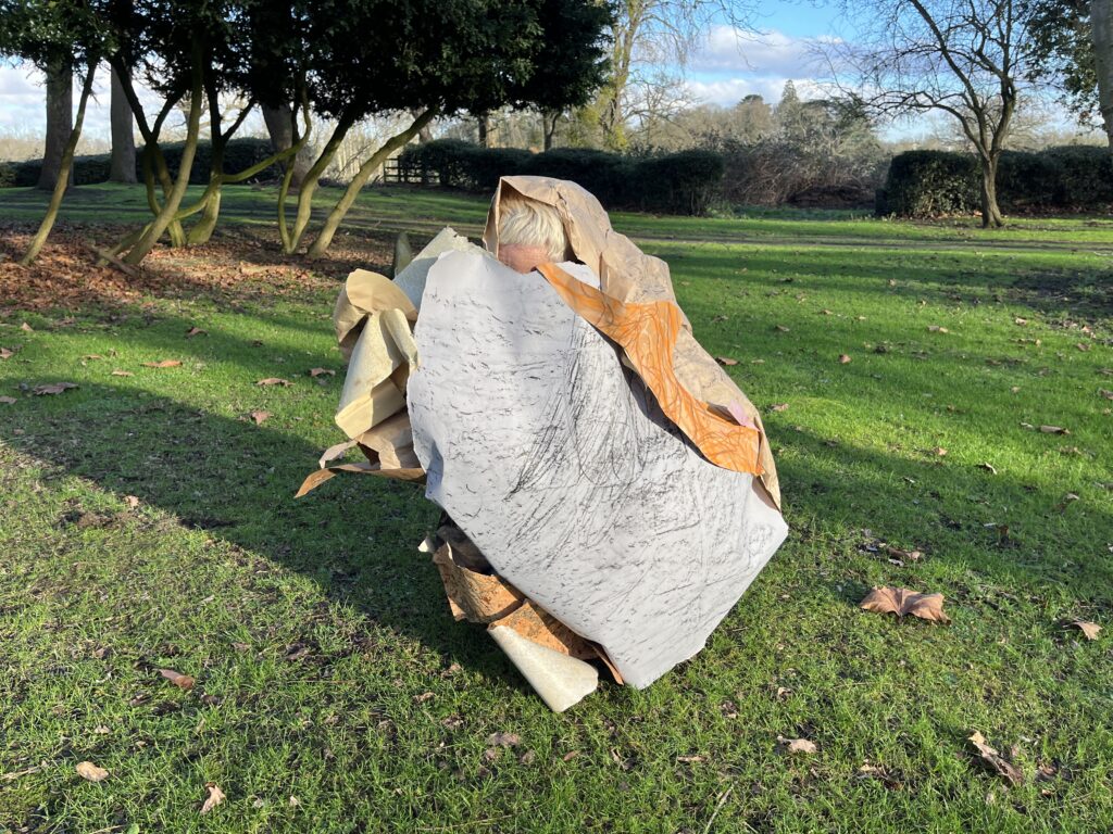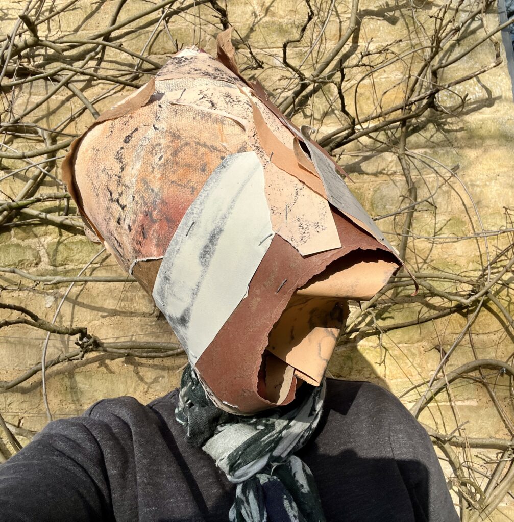 I stapled together paper covered in wax rubbings. I made a small version for my head, before placing it on a mantle piece alongside some collages. Hiding within a larger stapled together one I went into the landscape and crouched, waiting, moving very slowly, being rolled by time. Finally I squashed the costume into small pebbles and threw them into a stream.